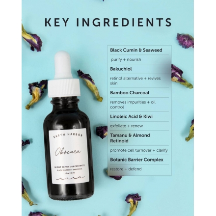 Tinh chất tái tạo da EARTH HARBOR NATURALS Obscura Night Repair Concentrate được chiết xuất từ Tảo đen, Bakuchiol, Hạt thì là đen, Than tre và Axit Linoleic, giúp thanh lọc da dễ dàng – đánh bay độc tố, mụn nhọt và tình trạng xỉn màu.